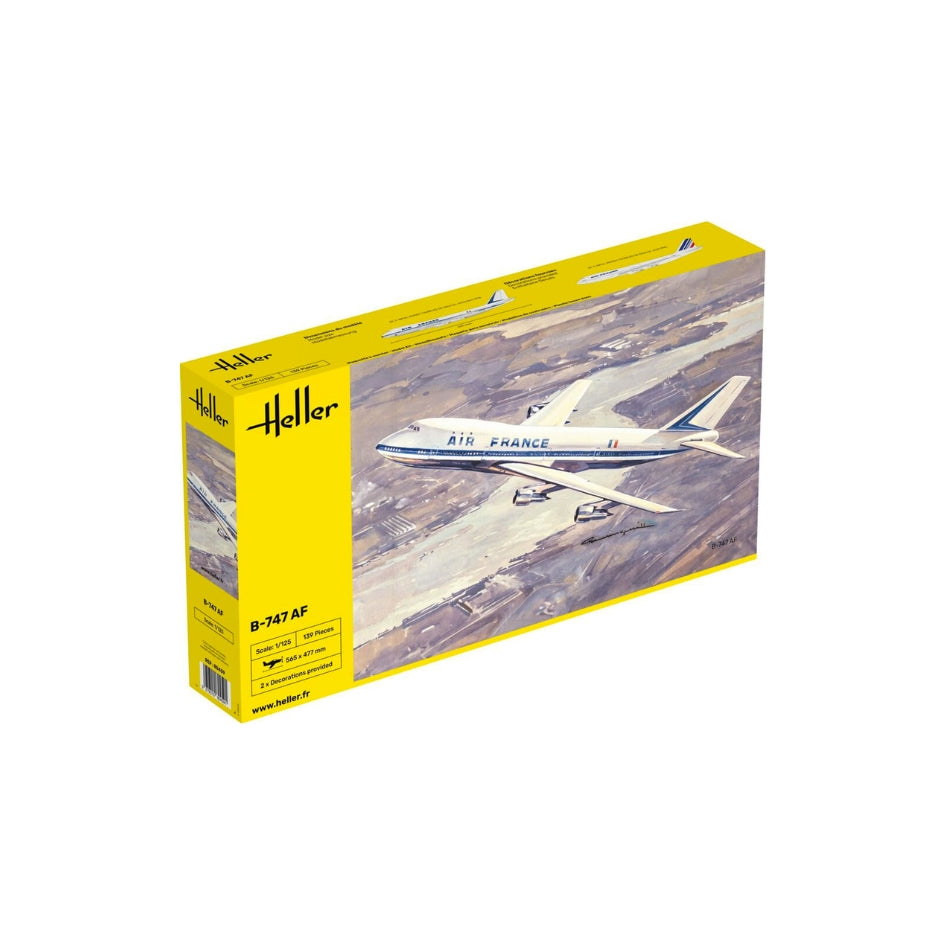 Assembled model 1/125 passenger plane B-747-200 AF Boeing Heller 80459 The 747 was launched on April 13, 1966 by the Boeing Aircraft Company. The leader of the new generation of aircraft, the Boeing 747 surpasses the older 707 with its passenger capacity and somewhat colossal dimensions. Being the initial force of a new and such a promising era, the Boeing 747 can already be considered a reference aircraft in the development of air transport. In 1969, the 747-100 made its first flight, carrying 366 passengers over 8,560 km and remains the largest commercial aircraft in the world.