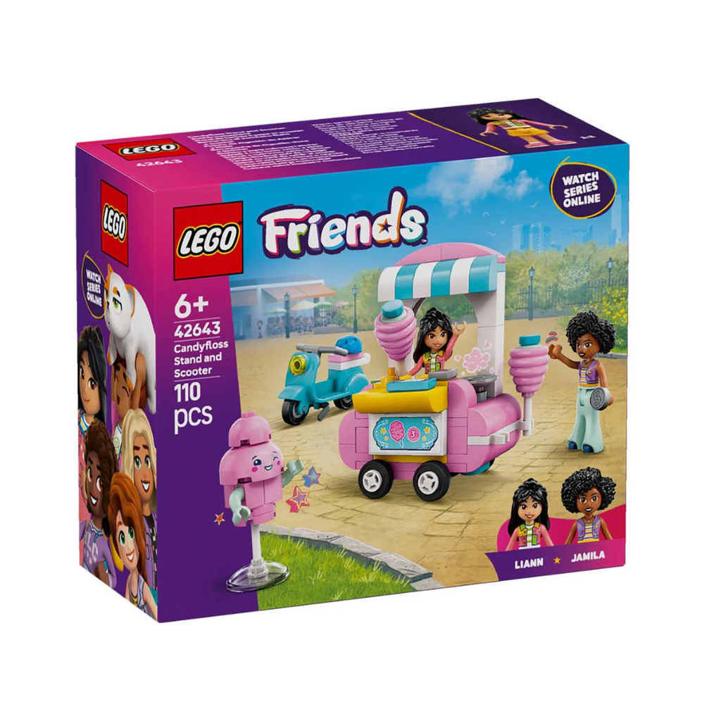 Inspire sugar-sweet pretend play for kids aged 6 and up with the LEGO® Friends Cotton Candy Stand and Scooter (42643) toy. The set comes with 2 LEGO Friends minidolls and features a buildable mobile food cart, scooter, mascot and accessories.