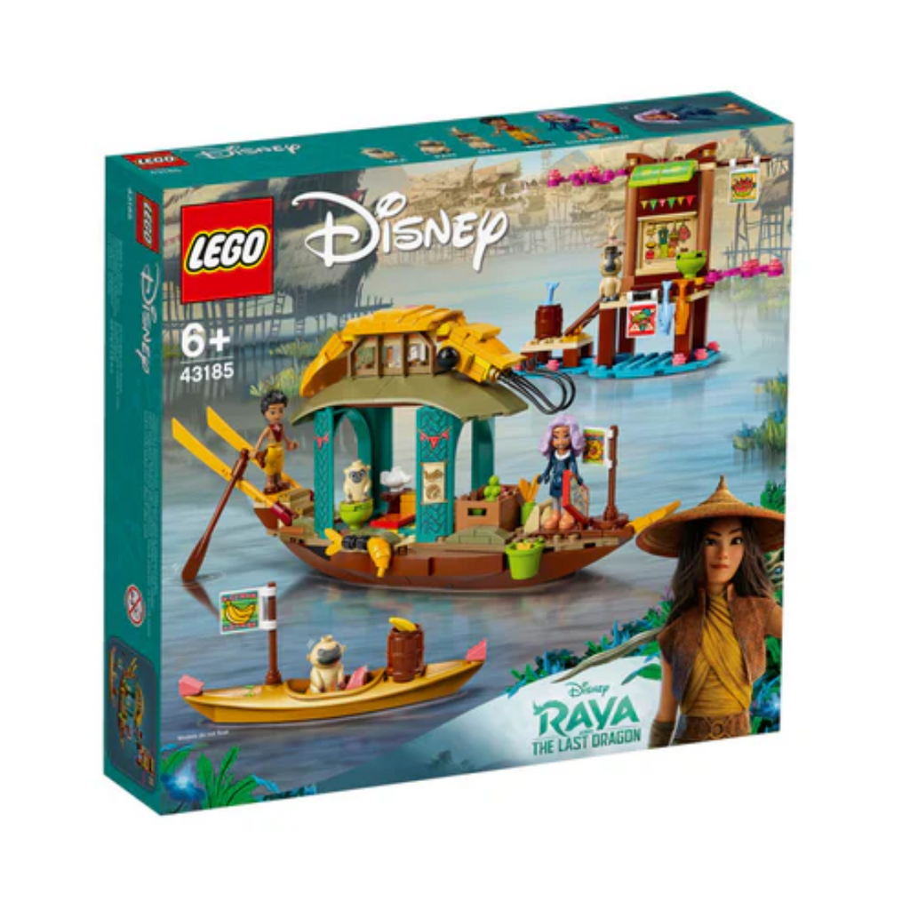 • This set, based on the new movie Disney’s Raya and the Last Dragon, includes a large shrimp boat, a smaller boat and a dock area, plus Sisu Human and Boun mini-doll figures and 3 Ongi LEGO® figures.