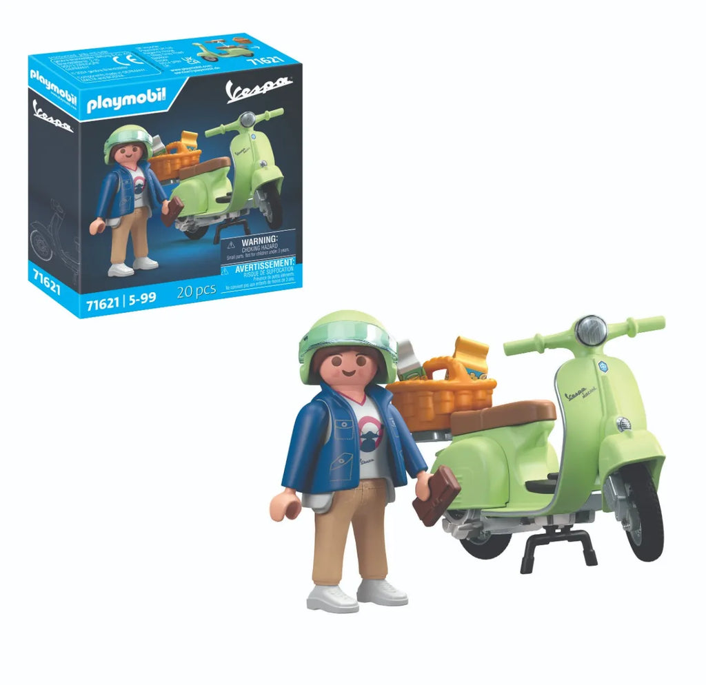 Saddle up on 1969 Vespa 150 Sprint Veloce in light green by PLAYMOBIL! Inspired by the Piaggio scooter model Vespa 150 Sprint Veloce, this authentic PLAYMOBIL Vespa combines charm with timeless elegance. The lovingly designed Vespa is complemented by a PLAYMOBIL figure and a variety of accessories. Groceries and wallet can be stored in the basket behind the seat. With the various saddle variants, with and without a figure seat, the scooter can be customized. Whether you're an experienced rider or a beginner, this set is perfect for children and adult Vespa fans alike. Experience the spirit of the road with the iconic 1969 Vespa 150 Sprint Veloce in light green by PLAYMOBIL!