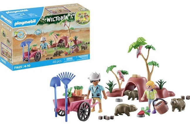 Box dimensions: 28.4 x 18.7 x 7.4 cm Product dimensions: 38.8 x 19.5 x 29.6 cm Age: 4 years and up Sustainable PLAYMOBIL playset Wombat Shelter with two PLAYMOBIL figures, wombats, cockatoos, and many other great plants and accessories.