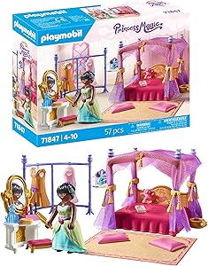 Box dimensions: 24.8 x 18.7 x 7.2 cm Product dimensions: 37.7 x 19.7 x 26.0 cm Weight: 249 g Age: 4 years and up In the princess's canopy bed, you can sleep wonderfully and dream fairy-tale dreams. With the three dresses that can be freely exchanged and hung up, the princess always has the right outfit at hand. The two comfortable cushions invite you to take a short break or have a nice chat between friends. At the elegant dressing table, new looks can be created, preparing the princess for any occasion.