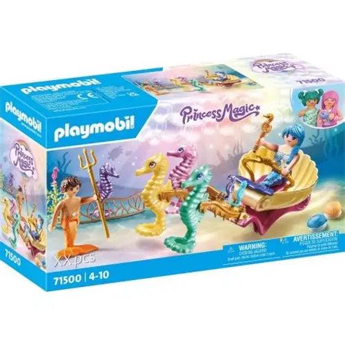 Dive in and play with the fantastic PLAYMOBIL playset, Mermaid with Seahorse Carriage. Alongside seahorses, mermaids explore the ocean in their shimmering underwater carriage. What adventures await them today? The Princess Magic Mermaid World by PLAYMOBIL invites children into a magical underwater realm. The lovingly crafted figures and animals inspire children aged 4 and above to embark on imaginative adventures. The set includes two PLAYMOBIL figures, four large seahorses, an underwater carriage, and many other accessories. Decorative shells can be easily attached to smooth surfaces with suction cups.