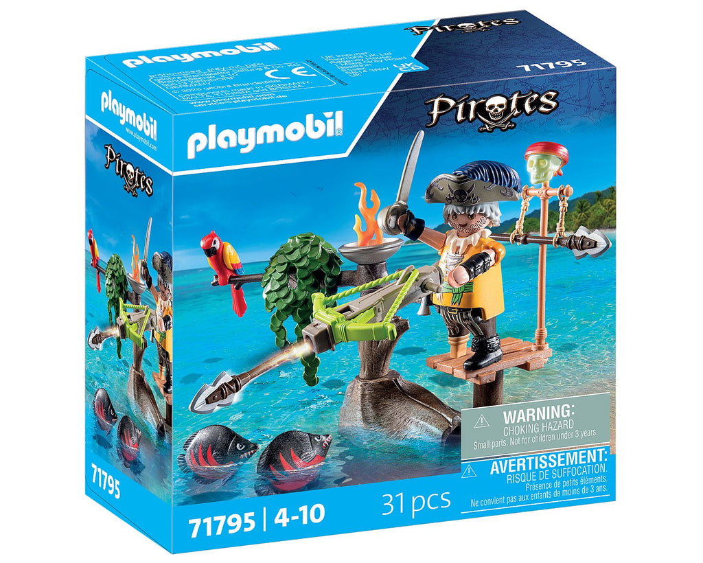 The female pirate sets out on her raft to search for a forgotten treasure. Armed with two cannons, she defies the dangers of the open sea. Her equipment is safely stored in a barrel. At the end of her adventurous journey, she discovers the mysterious crystal skull artifact. Can she recover the treasure and fend off the dangers of the sea? Her cannons are crucial in this endeavor.