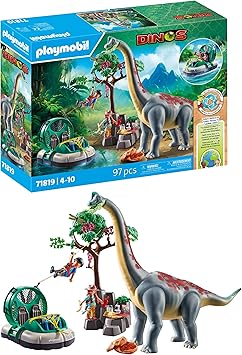 Box dimensions: 20.28 x 15.16 x 4.92 in Product dimensions: 15.35 x 10.16 x 20.59 in Weight: 40212.4 oz. Age: 4 years and up The brave research team approaches the gigantic Brachiosaurus with a hovercraft that can navigate actual water. While one of the researchers daringly swings on the zipline to the tree to observe the Brachiosaurus feeding, the researcher stays back at a safe distance. She focuses on documenting the dinosaur's behavioral patterns using her advanced equipment. The Brachiosaurus, equipped with a movable jaw, leisurely plucks leaves from the trees. Includes a dinosaur knowledge card.