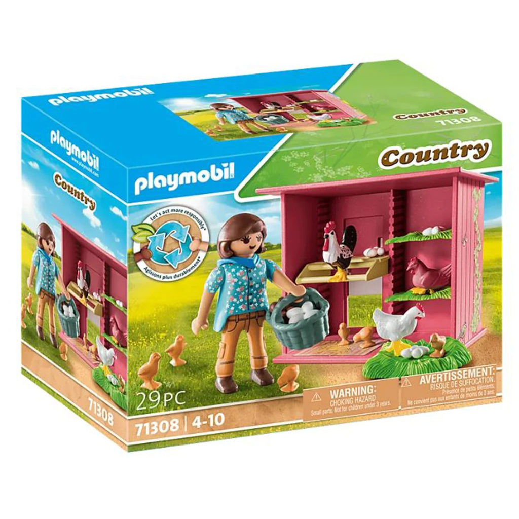 What would be a farm without chickens? With this colorful PLAYMOBIL playset, the chickens can move into your farm. The hen house is equipped with two shelves and a perch and is home to two hens, a rooster and six chicks. The hens and rooster can be fixed to the perch with the feet. The sliding board at the back of the house can be opened and closed. Give your hen house an individual touch with the included cheerful stickers. The 28-piece toy set includes a PLAYMOBIL figure, a hen house as well as two chickens, a rooster and six chicks.