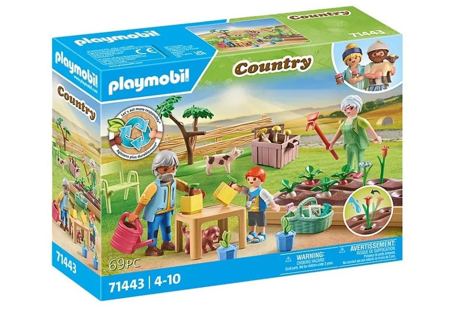 Introducing the PLAYMOBIL Country Vegetable Garden with Grandparents! Spark your child's imagination with this delightful toy set, designed for children aged 4 years and up. The set features grandparents and a grandchild, along with a piglet and a puppy. Made of over 80% sustainable material, it encourages eco-consciousness. Watch as the flowers "grow" when the bed is filled with water, plant new seedlings on the planting table, and cultivate mushrooms in the wooden box. Role-play has never been more rewarding!