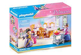 The right dining behavior is extremely important for every princess. The silent Princess Kim is currently sitting in the Countess's etiquette class and listening attentively to her words. "Always sit up straight, bring spoon and fork slowly and elegantly to your mouth, and above all do not shuffle," explains the Countess. The large table is festively set. Princess Kim is an erudite pupil, but she would much rather play beautiful melodies on her violin. Hopefully, the Countess will soon be finished with her explanations. The playset contains two PLAYMOBIL figures Princess Kim and the Countess, a table with two chairs, a candlestick, four plates and four glasses, a serving trolley, a sideboard, and other accessories. The figures can put on and take off their skirts.